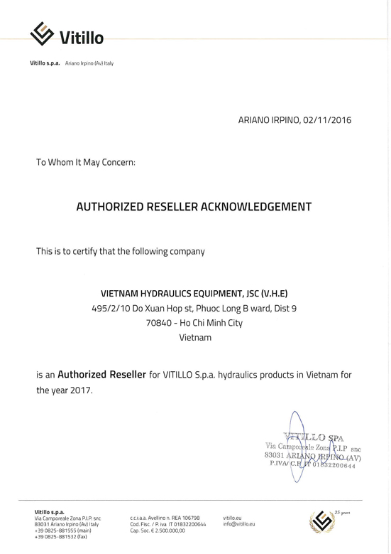 Từ ngày 02/11/2016, Công Ty Cổ Phần Thiết Bị Thủy Lực Việt Nam (V.H.E) đã chính thức là đại lý của hãng Vitillo tại Việt Nam.